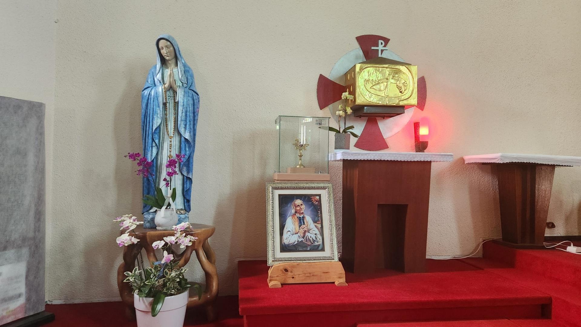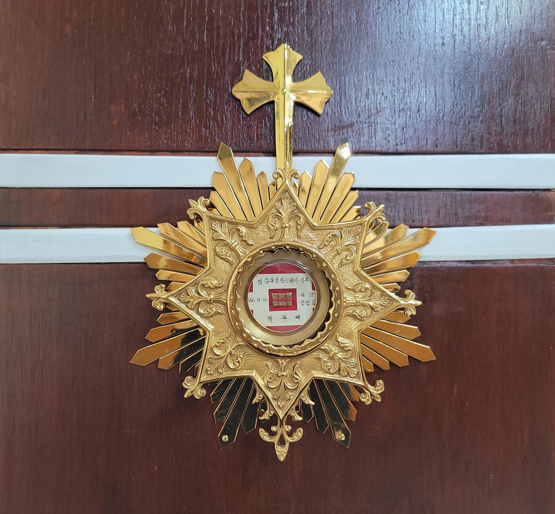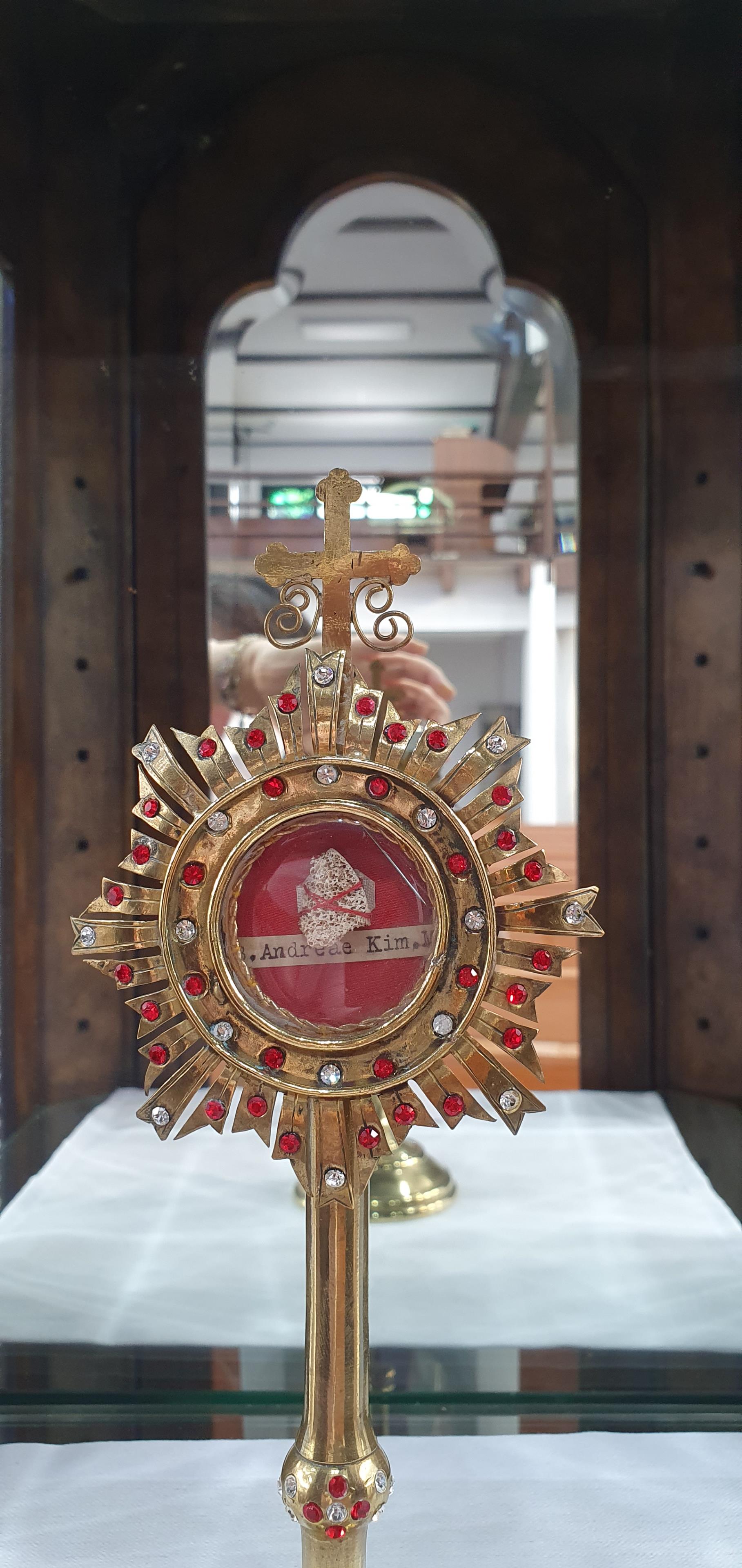 정확한 안치경로는 알수 없으나 본당에서 보관 중이던 성인 유해를 본당 설정 80주년이 되던 해(2016년) 지금의 위치에 따로 현시해서 모시고 있음.