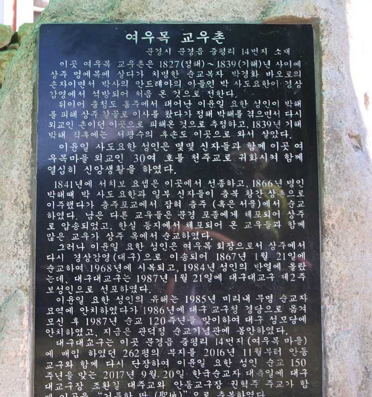 여우목 성지는 103위 성인인 이윤일 요한 성인과 서치보 요셉 가정에 의하여 이루어진 교우촌으로 부근에 있는 ‘건학’과 ‘부럭이’(부락이)라는 교우촌과 빈번한 접촉을 하면서 지냈다.