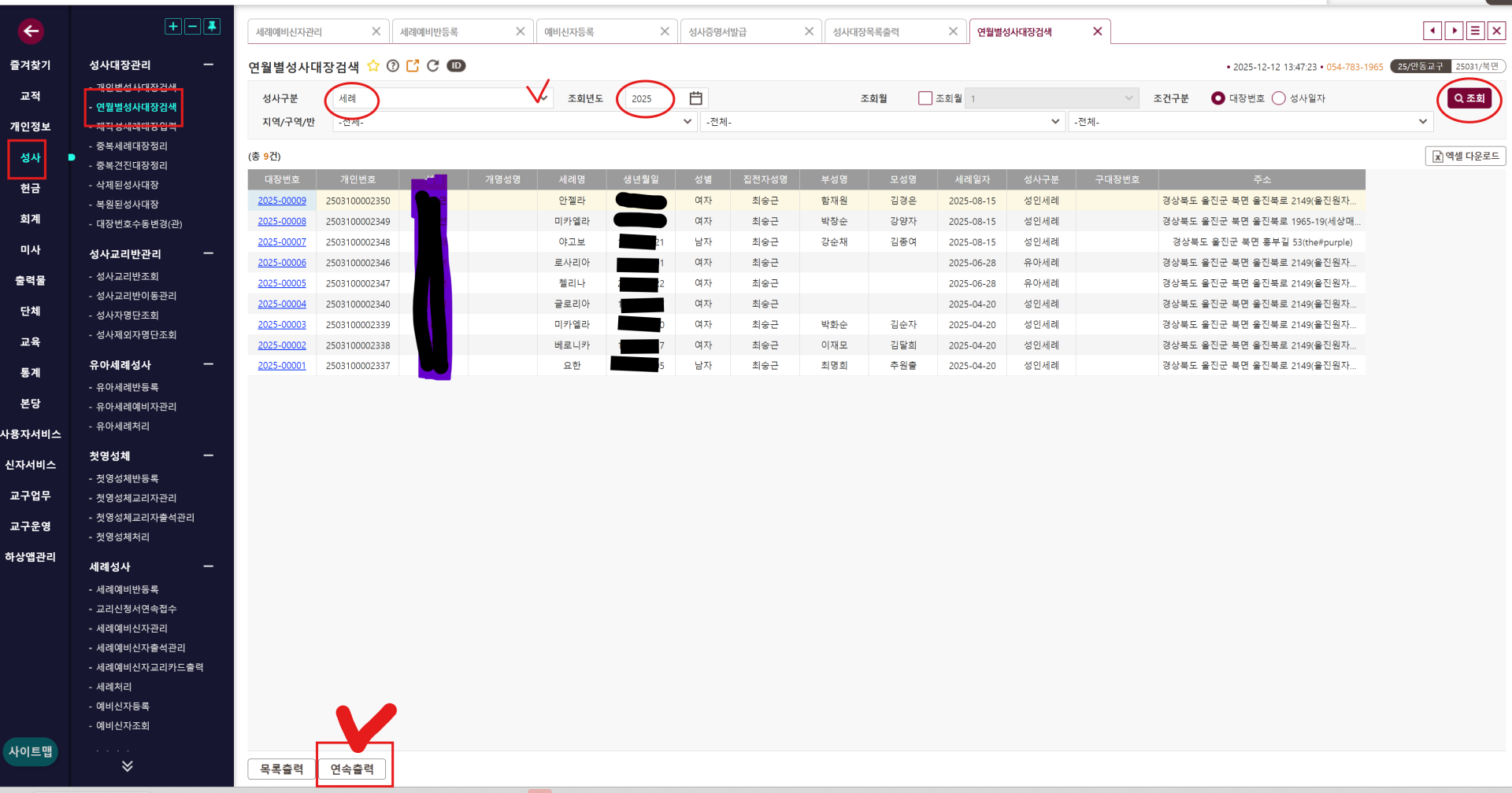 4. 2025년도 성사대장(세례, 견진, 혼인)은 출력하여 본당 주임신부 서명 후 1부는 본당 보관, 1부는 우편으로 교구에 제출.