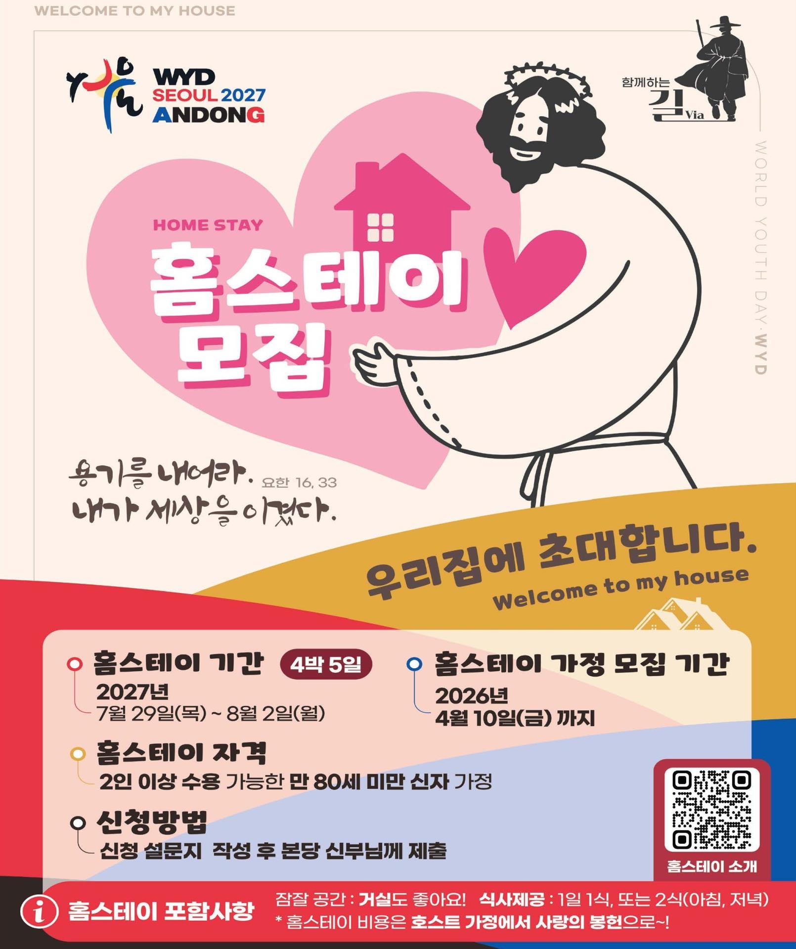 2027 서울 WYD 안동 교구대회 조직위원회는 WYD 안동 교구대회(DID) 때 우리 교구를 방문하는 외국 순례객이 머무를 홈스테이 가정을 모집합니다.