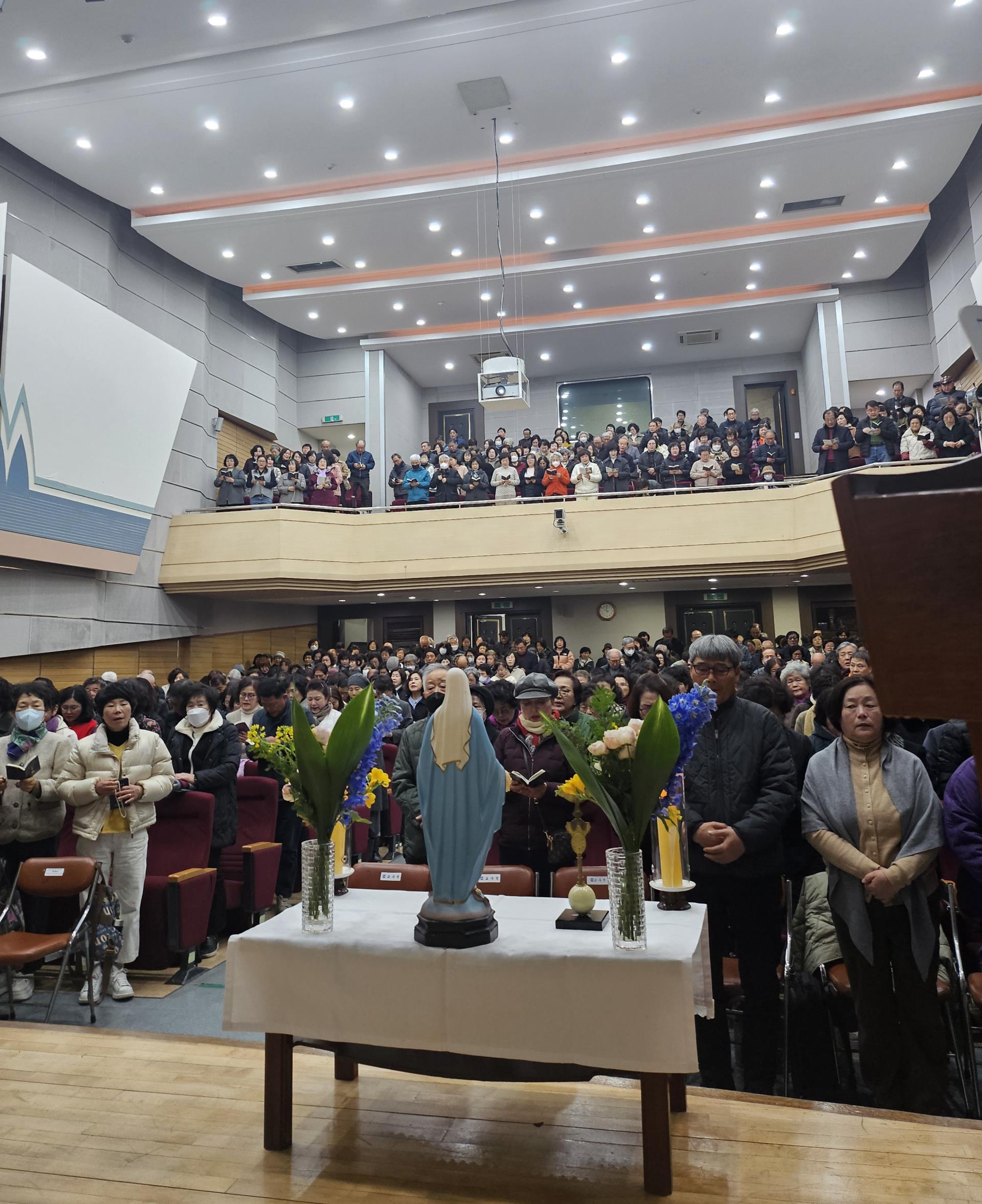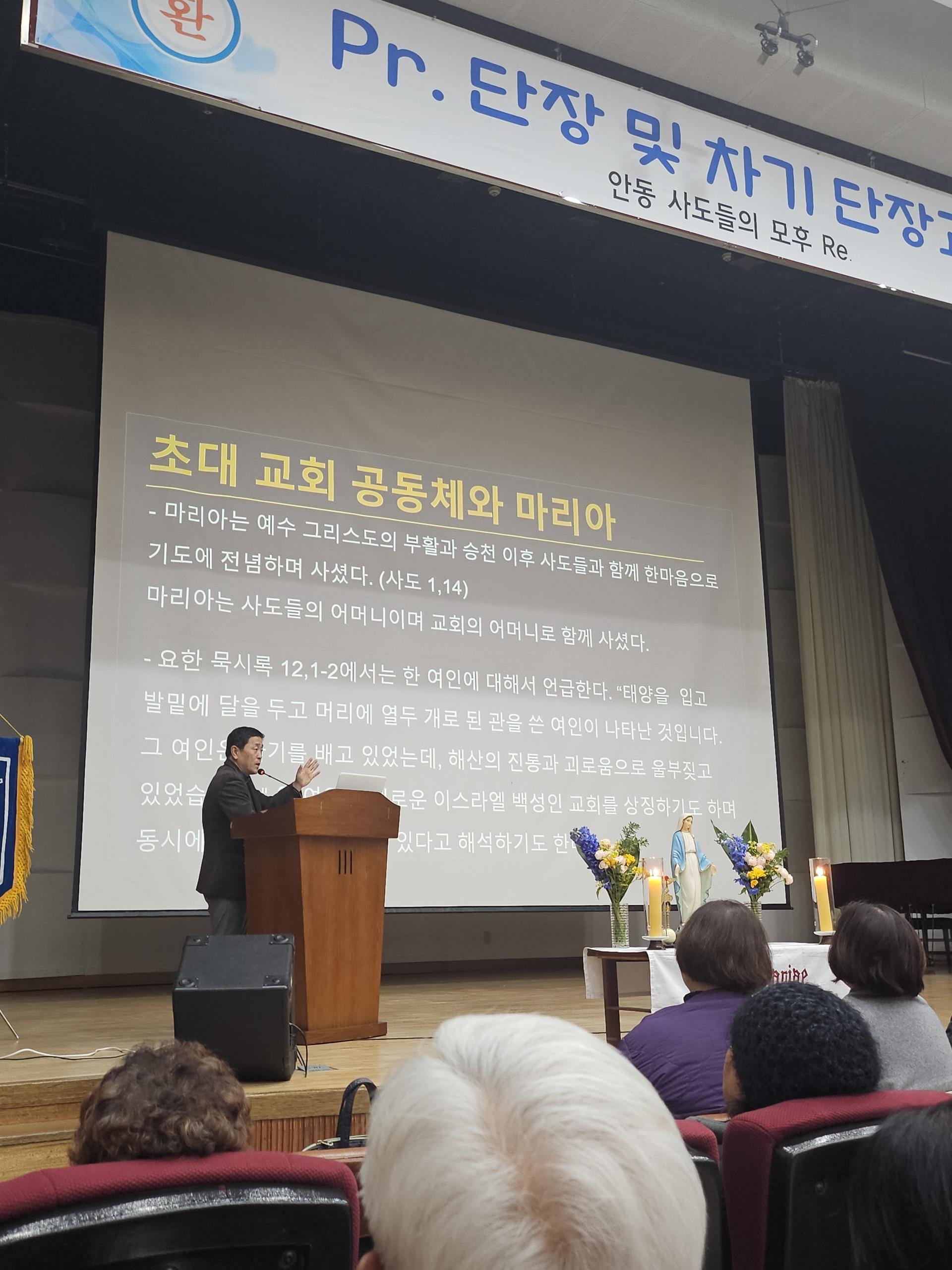 3월의 꽃샘추위 속에서도 525명의 레지오 마리애 단원들이 참석한 가운데, 울진 북면본당 주임 김진조 베드로 신부가 ‘현대 신학 안에서 만나는 성모님’을 주제로 강의를 진행했다. 김 신부는 유대인 마을의 한 산골 소녀에서 오늘날 천상 모후로 공경받기까지 성모님의 이야기와 정체성을 간결하고 이해하기 쉽게 설명했다.