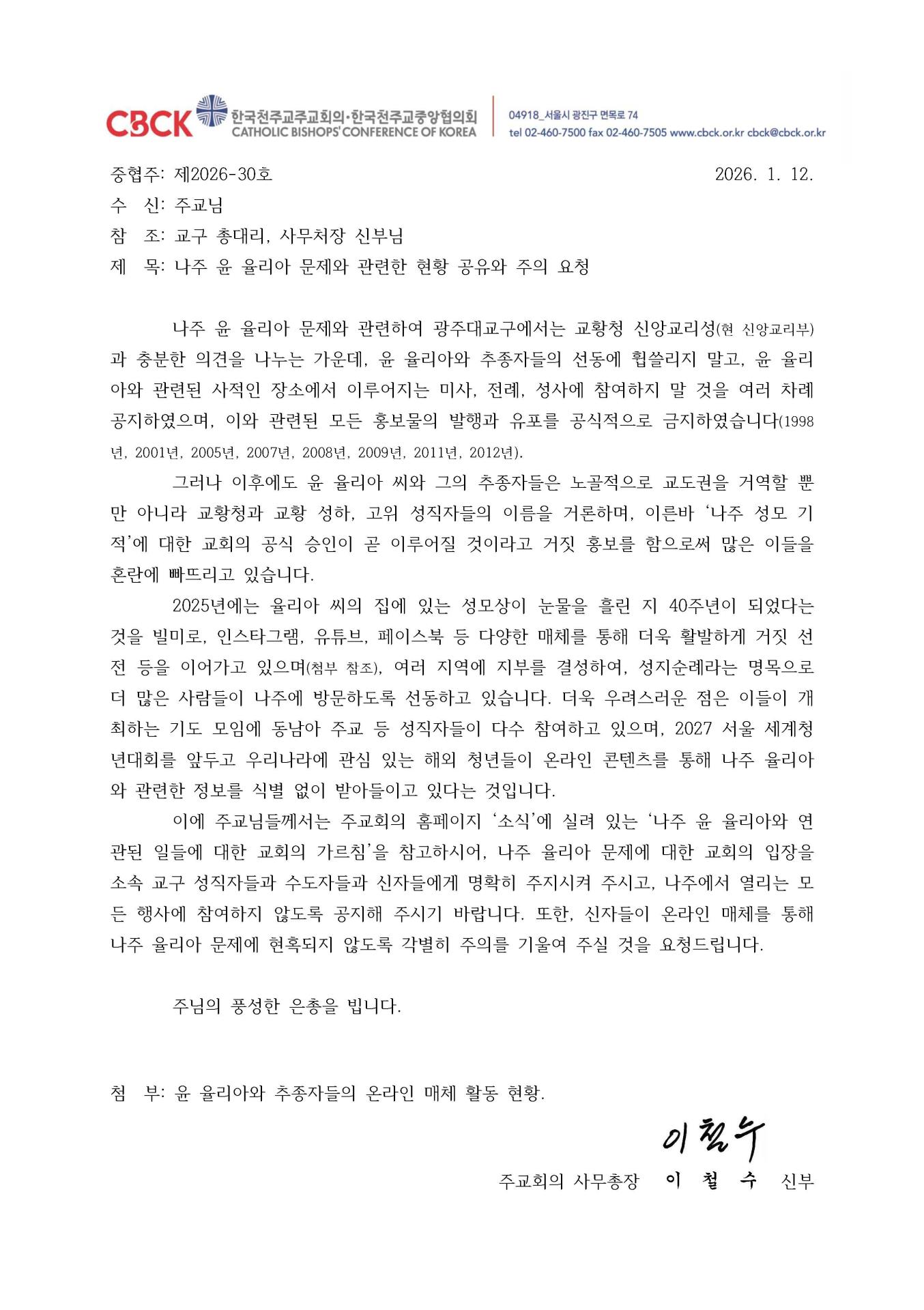 이에 주교님들께서는 주교회의 홈페이지 ‘소식’에 실려 있는 ‘나주 윤 율리아와 연관된 일들에 대한 교회의 가르침’을 참고하시어, 나주 율리아 문제에 대한 교회의 입장을 소속 교구 성직자들과 수도자들과 신자들에게 명확히 주지시켜 주시고, 나주에서 열리는 모든 행사에 참여하지 않도록 공지해 주시기 바랍니다. 또한, 신자들이 온라인 매체를 통해 나주 율리아 문제에 현혹되지 않도록 각별히 주의를 기울여 주실 것을 요청드립니다.
